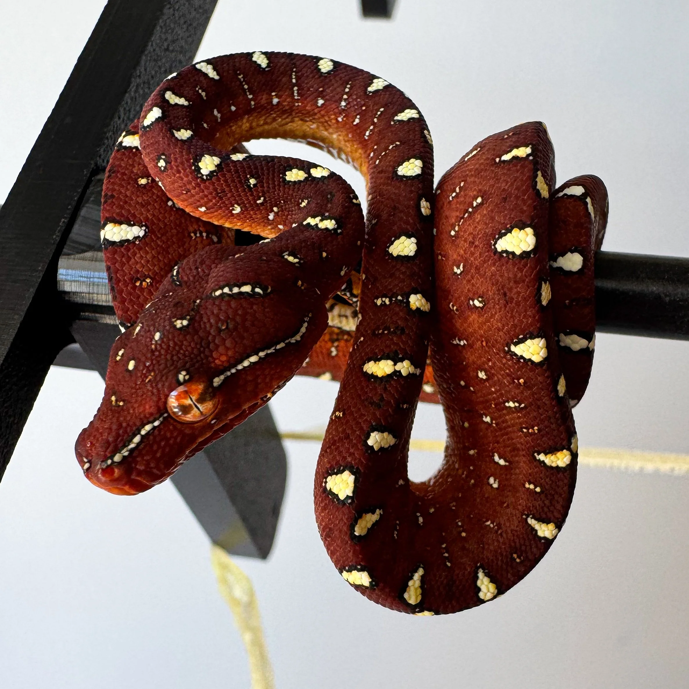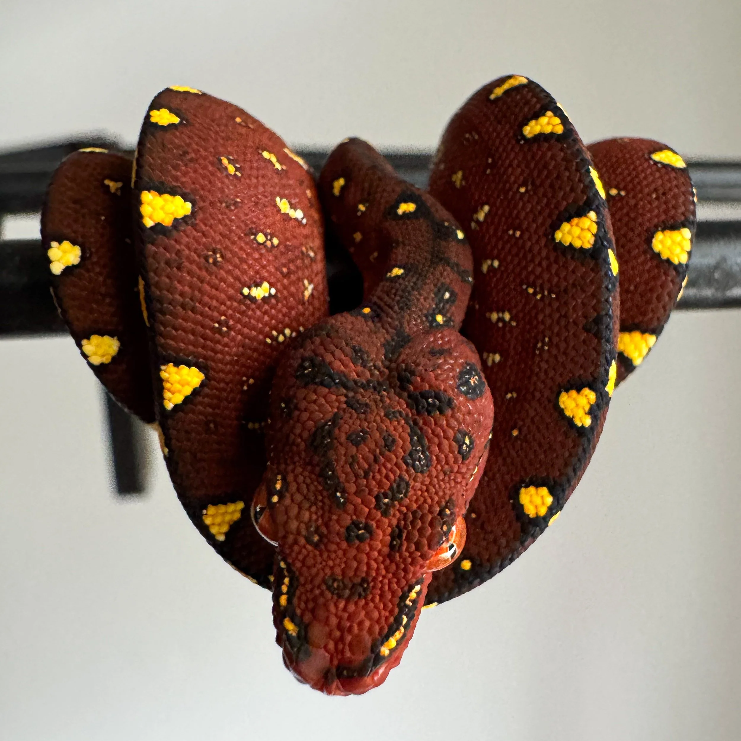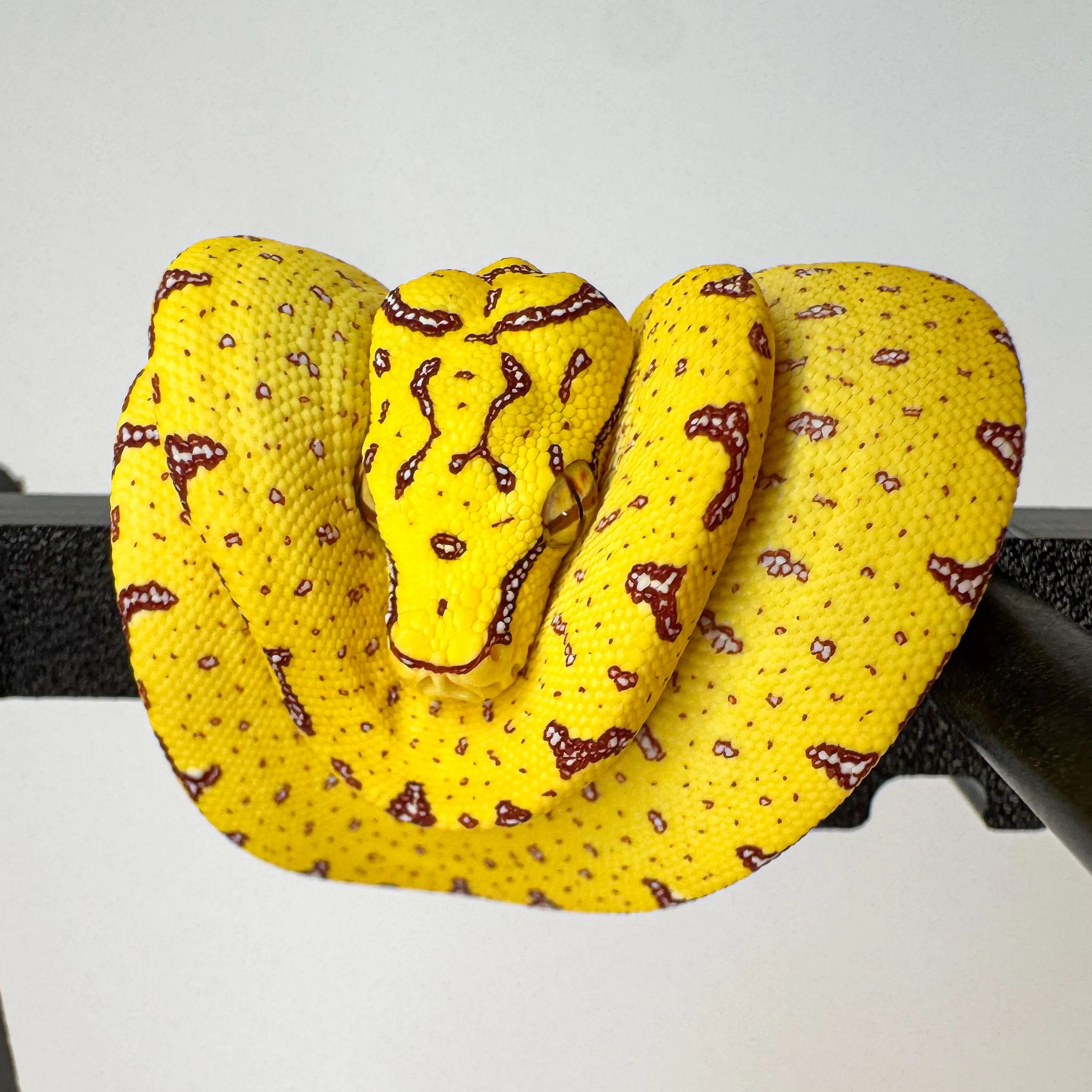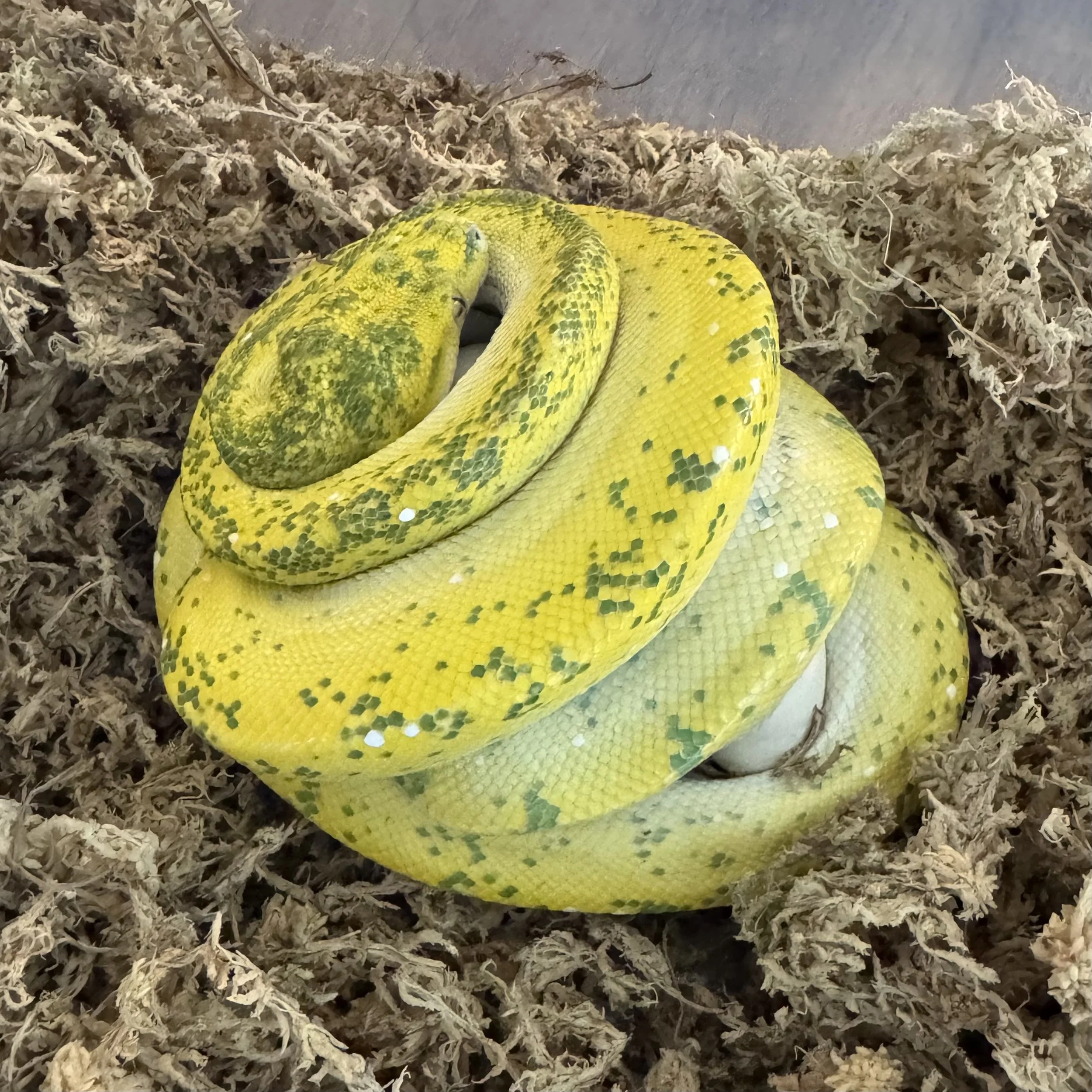 The sire for this clutch was produced by Rod Love at Amore Arboreals. He was a maroon neonate and his sire was out of Popcorn (Biak x OSHY/Trooper Walsh Blueline) to Sissy (Aru x Sorong) while his dam was out of Lucia (Carpetman/Queen) to Duffman (Mr. Blue/Carolina x OSHY). While relatively green, his genetics contain a great mix of both blueline animals as well as high yellow animals. The dam for this clutch was produced by John Leckie at JL Chondros. She is a 4th generation high yellow animal who’s lineage is primarily composed of Robert Worrell’s Jade and Baby Doll lines (which have produced many high yellow and melanistic animals) and Janet Hickner’s Golden Glow Worms. Lumen was a yellow neonate and John’s pairings have notoriously produced outstanding HY animals from both yellow and red neonates. Nine “good” eggs and one slug were laid and resulted in 8 large neonates.