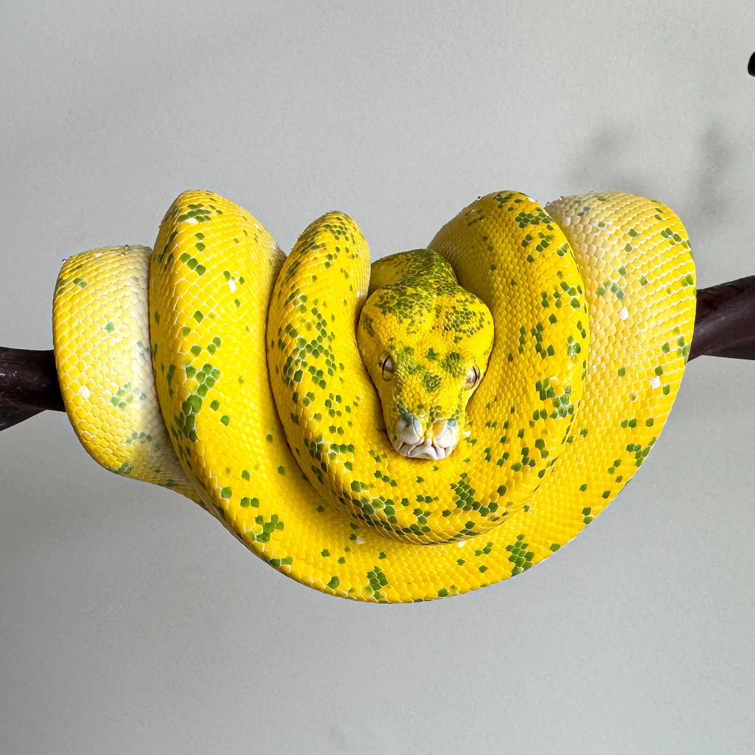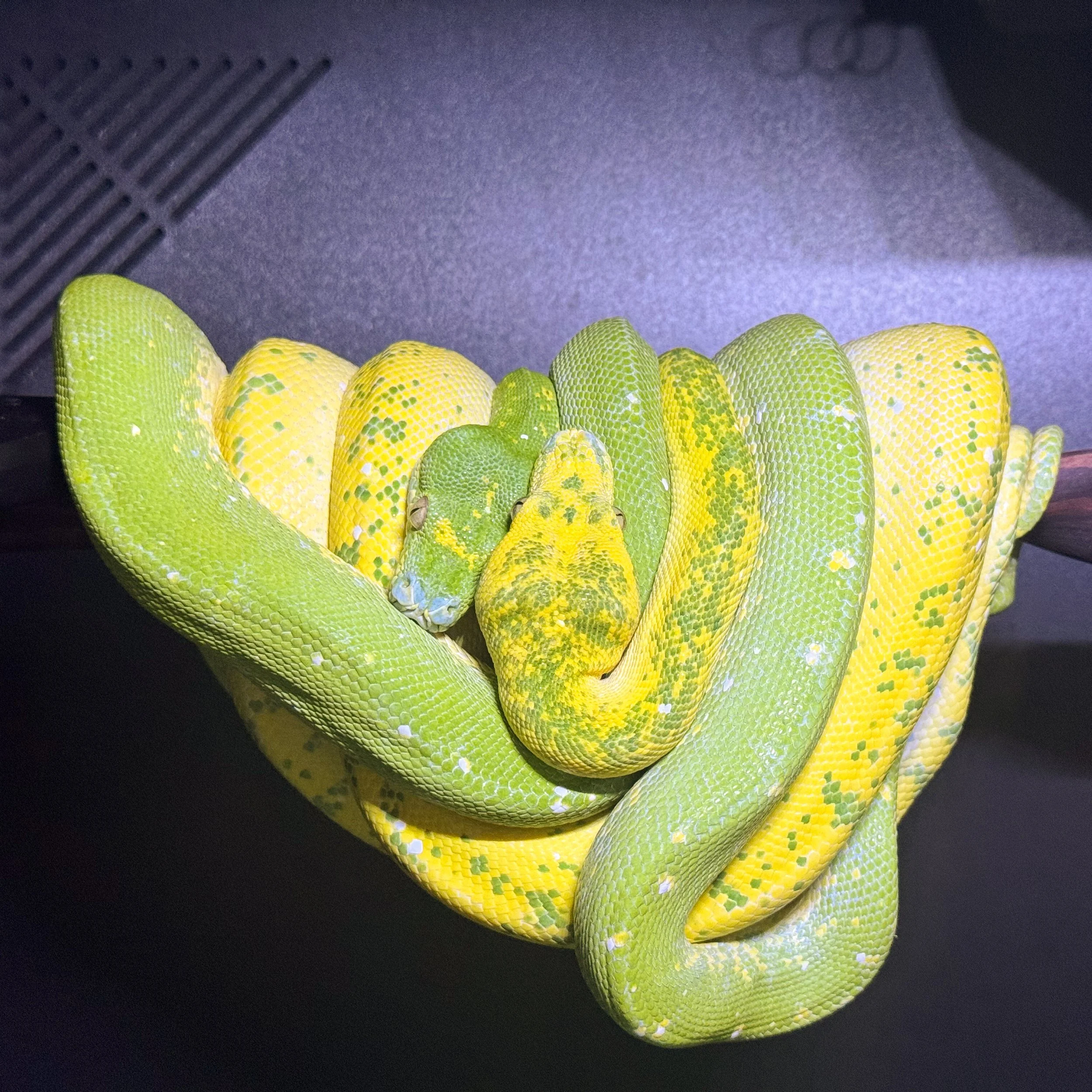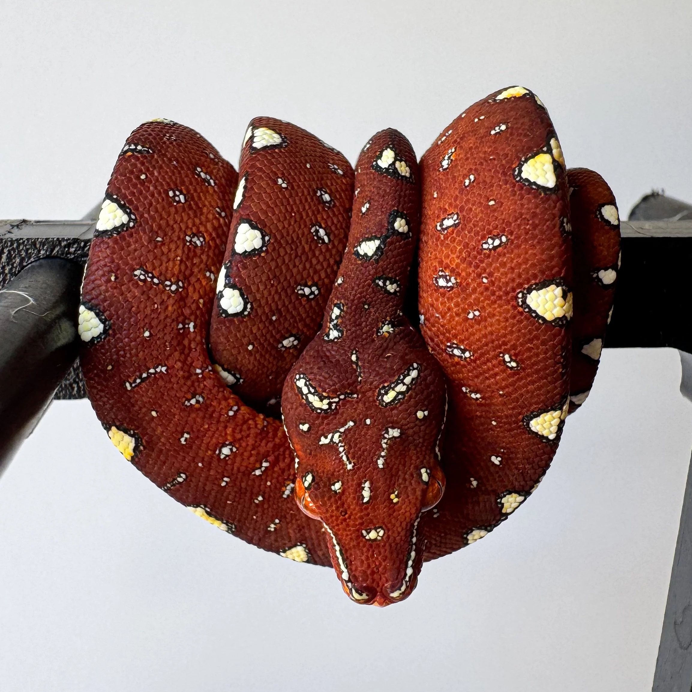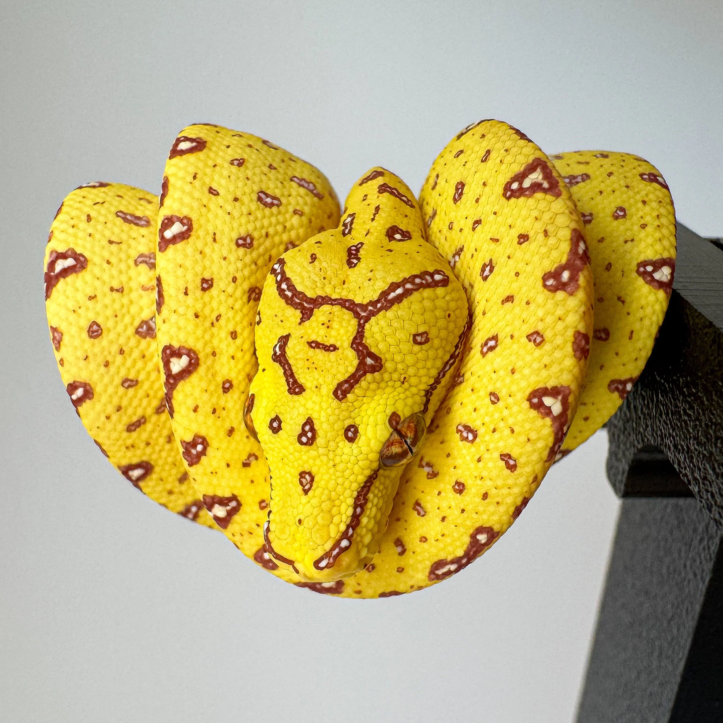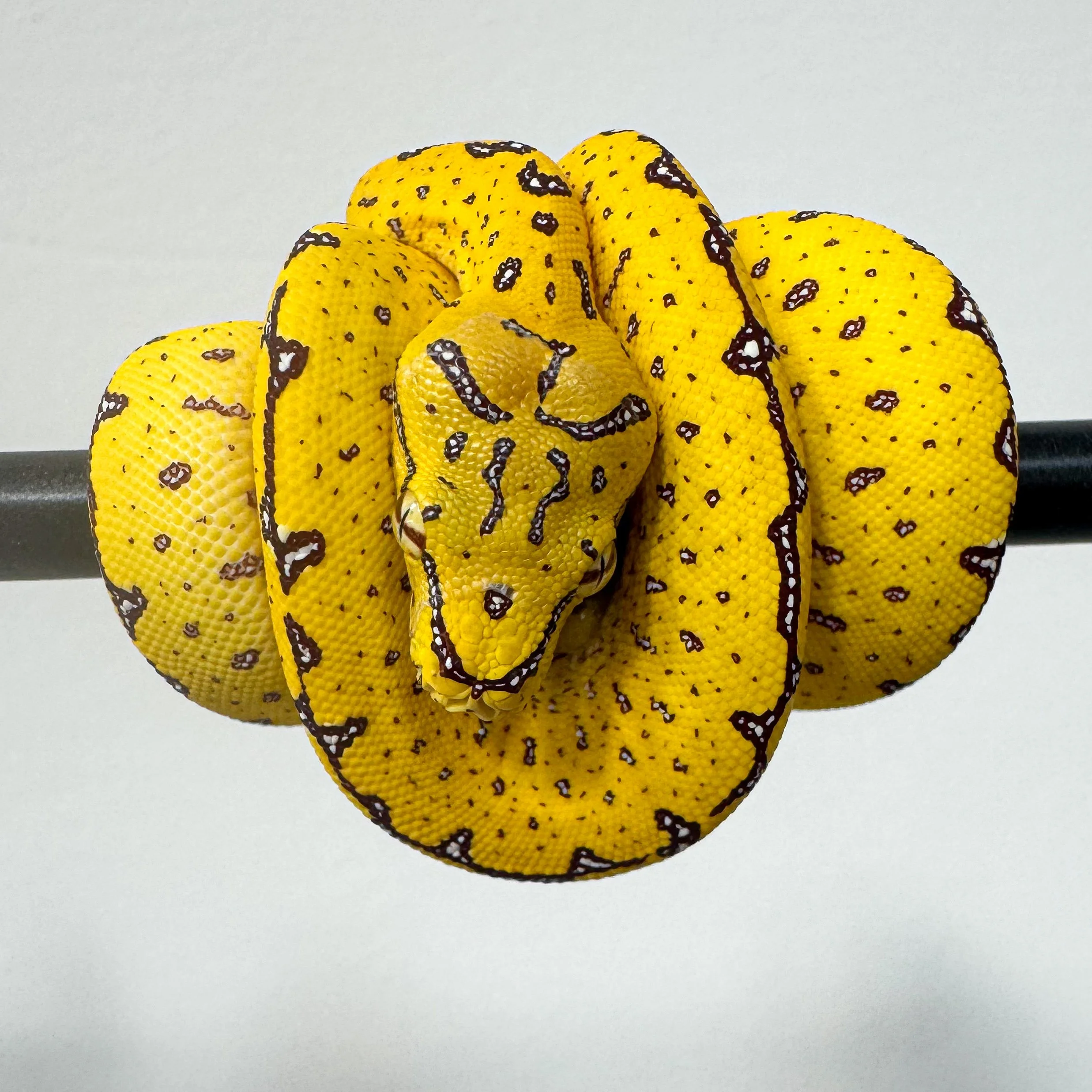 The sire for this clutch was produced by Rod Love at Amore Arboreals. He was a maroon neonate and his sire was out of Popcorn (Biak x OSHY/Trooper Walsh Blueline) to Sissy (Aru x Sorong) while his dam was out of Lucia (Carpetman/Queen) to Duffman (Mr. Blue/Carolina x OSHY). While relatively green, his genetics contain a great mix of both blueline animals as well as high yellow animals. The dam for this clutch was produced by John Leckie at JL Chondros. She is a 4th generation high yellow animal who’s lineage is primarily composed of Robert Worrell’s Jade and Baby Doll lines (which have produced many high yellow and melanistic animals) and Janet Hickner’s Golden Glow Worms. Lumen was a yellow neonate and John’s pairings have notoriously produced outstanding HY animals from both yellow and red neonates. Nine “good” eggs and one slug were laid and resulted in 8 large neonates.