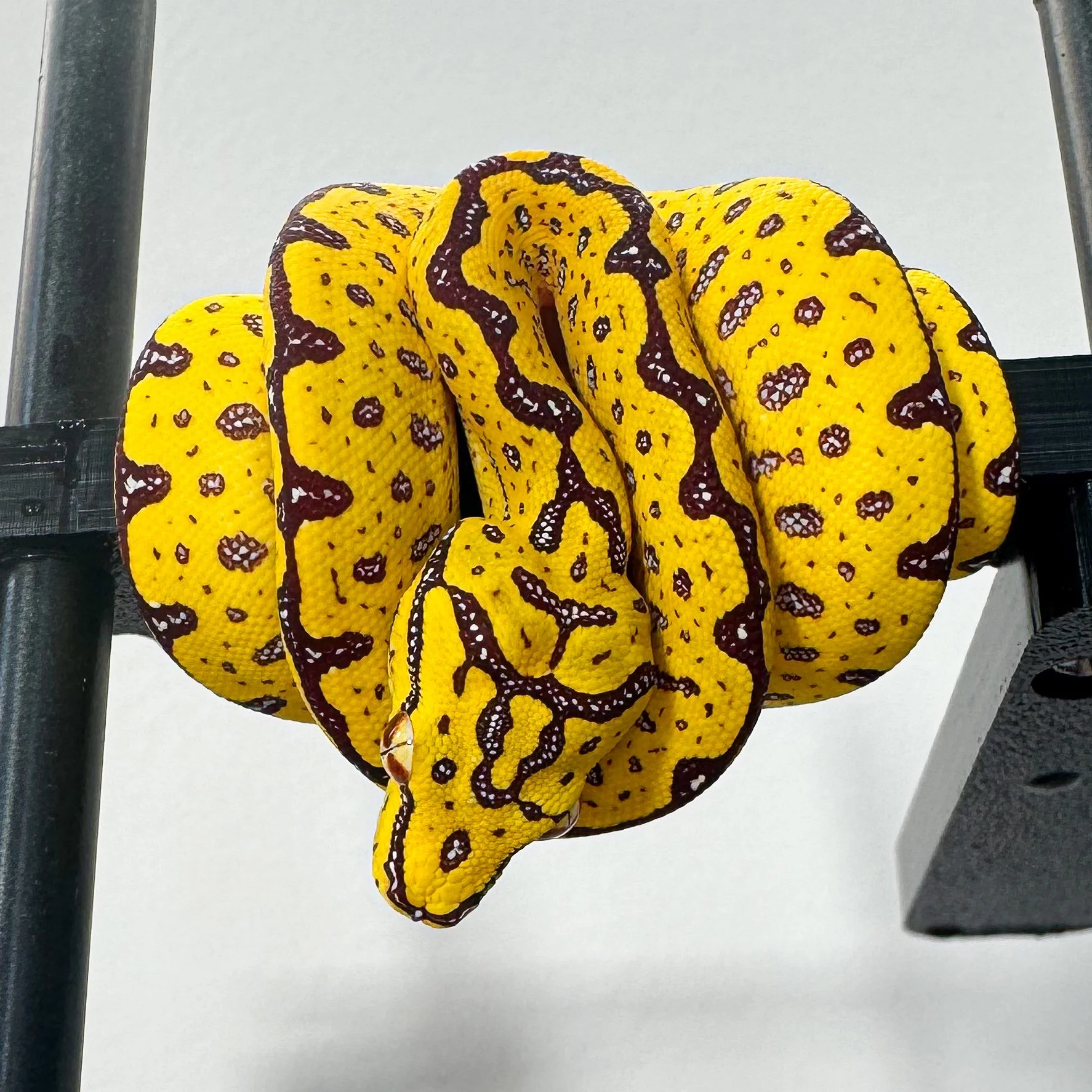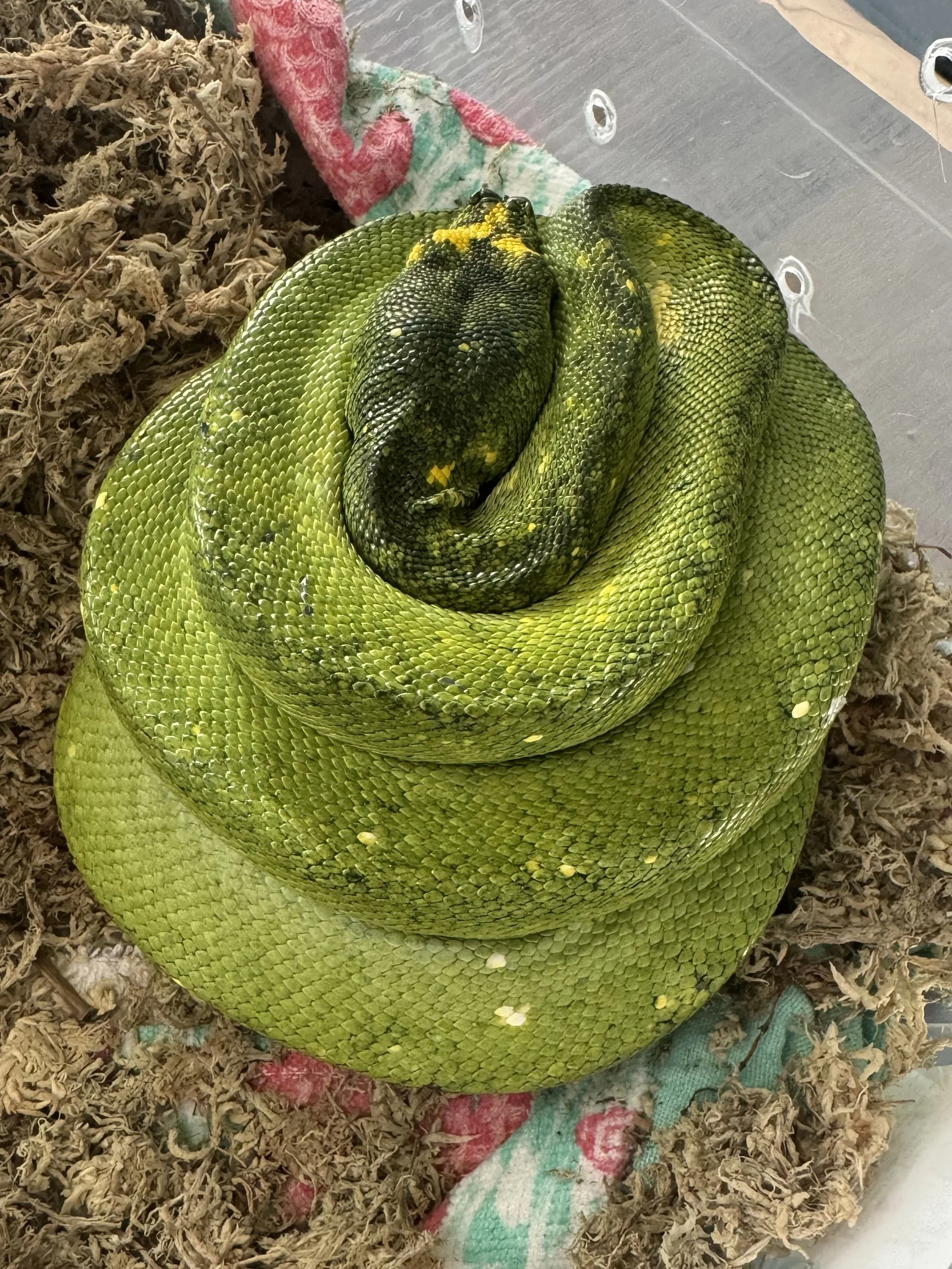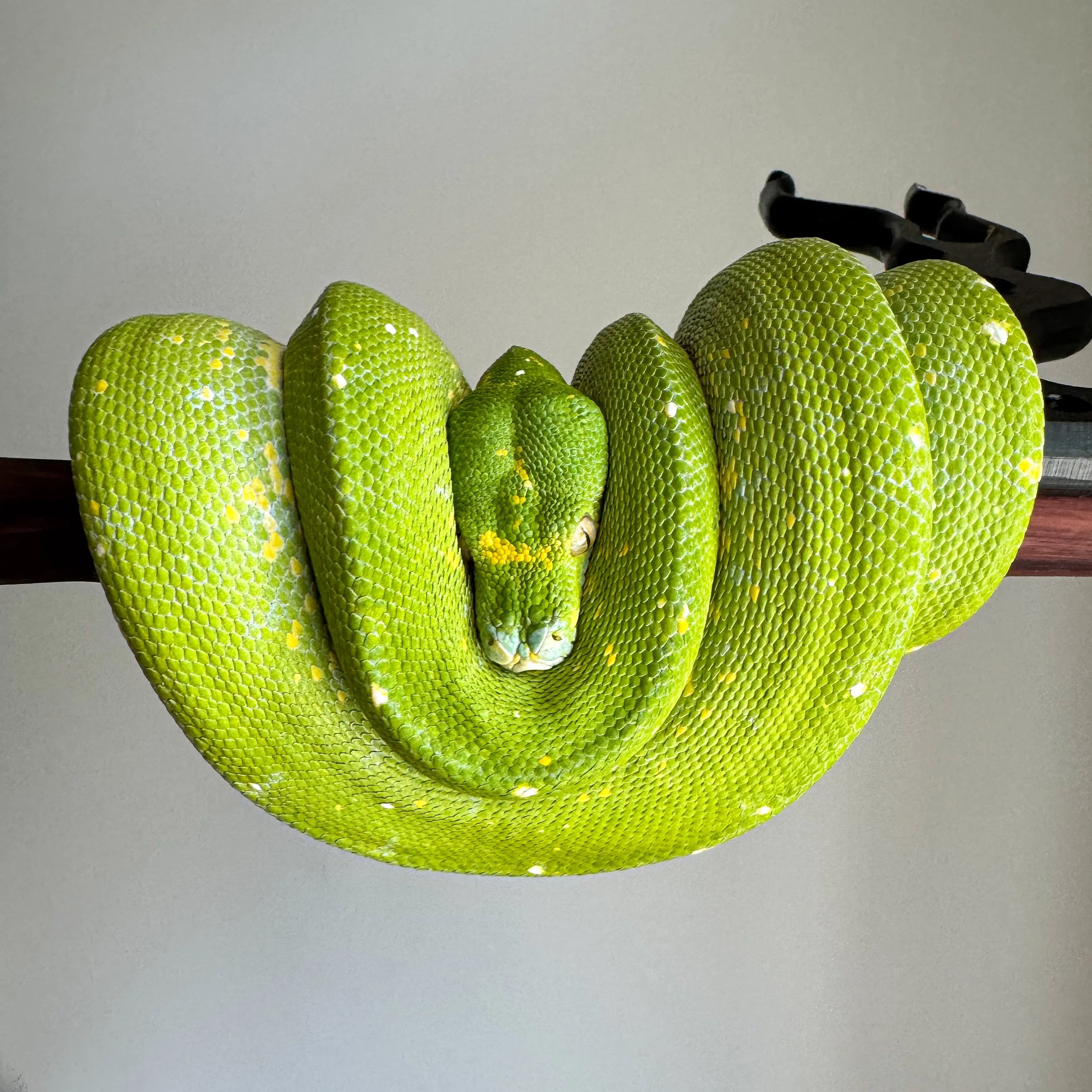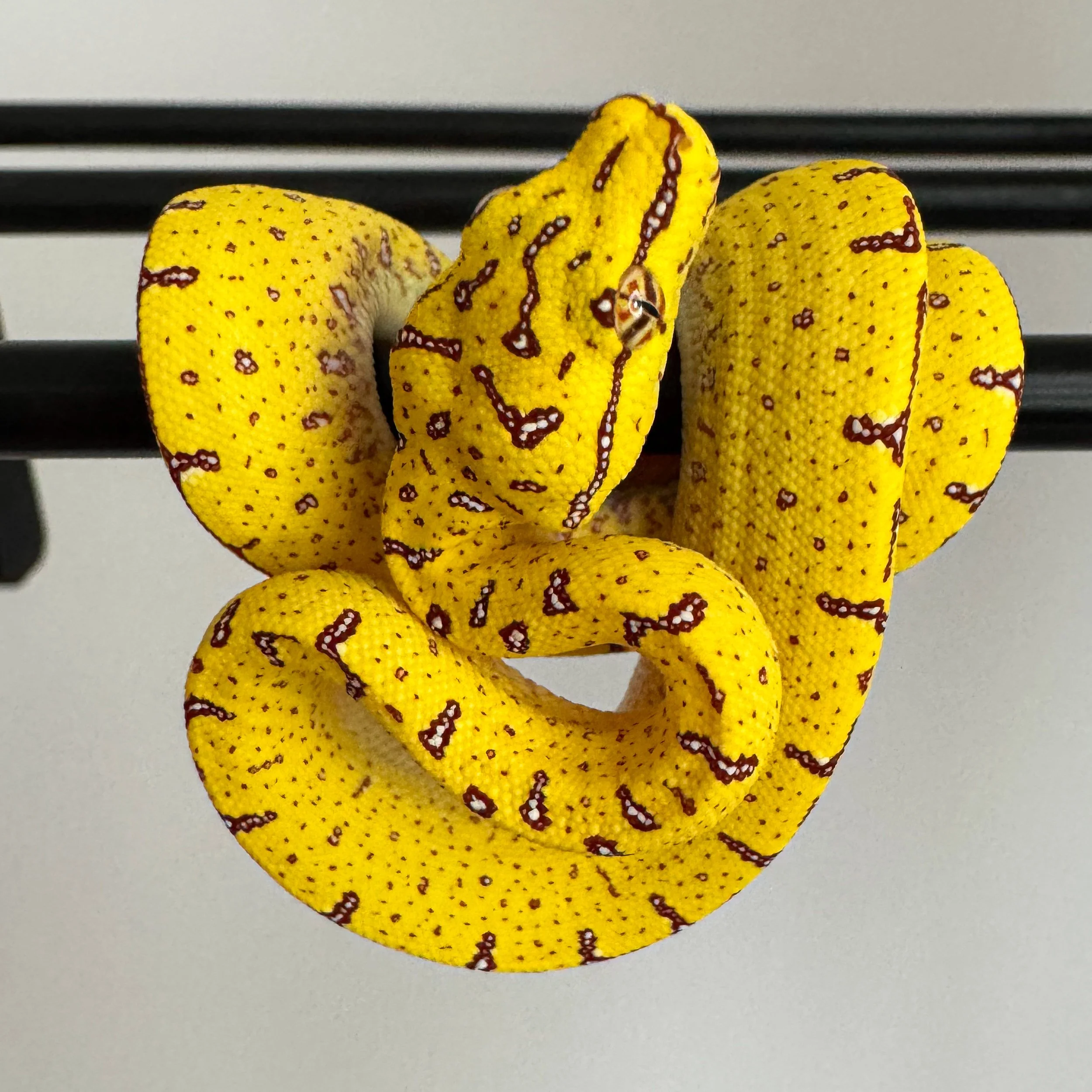 The sire for this clutch was produced by Rod Love at Amore Arboreals. He was a maroon neonate and his sire was out of Popcorn (Biak x OSHY/Trooper Walsh Blueline) to Sissy (Aru x Sorong) while his dam was out of Lucia (Carpetman/Queen) to Duffman (Mr. Blue/Carolina x OSHY). While relatively green, his genetics contain a great mix of both blueline animals as well as high yellow animals. The dam for this clutch was produced by John Leckie at JL Chondros. She is a 4th generation high yellow animal who’s lineage is primarily composed of Robert Worrell’s Jade and Baby Doll lines (which have produced many high yellow and melanistic animals) and Janet Hickner’s Golden Glow Worms. Lumen was a yellow neonate and John’s pairings have notoriously produced outstanding HY animals from both yellow and red neonates. Nine “good” eggs and one slug were laid and resulted in 8 large neonates.