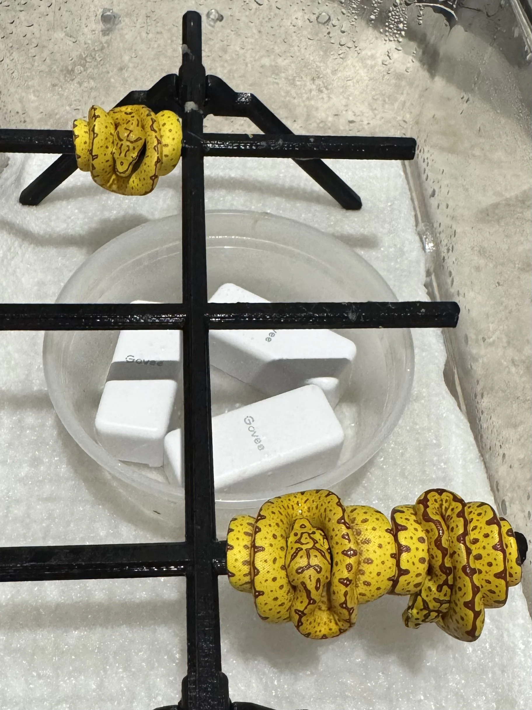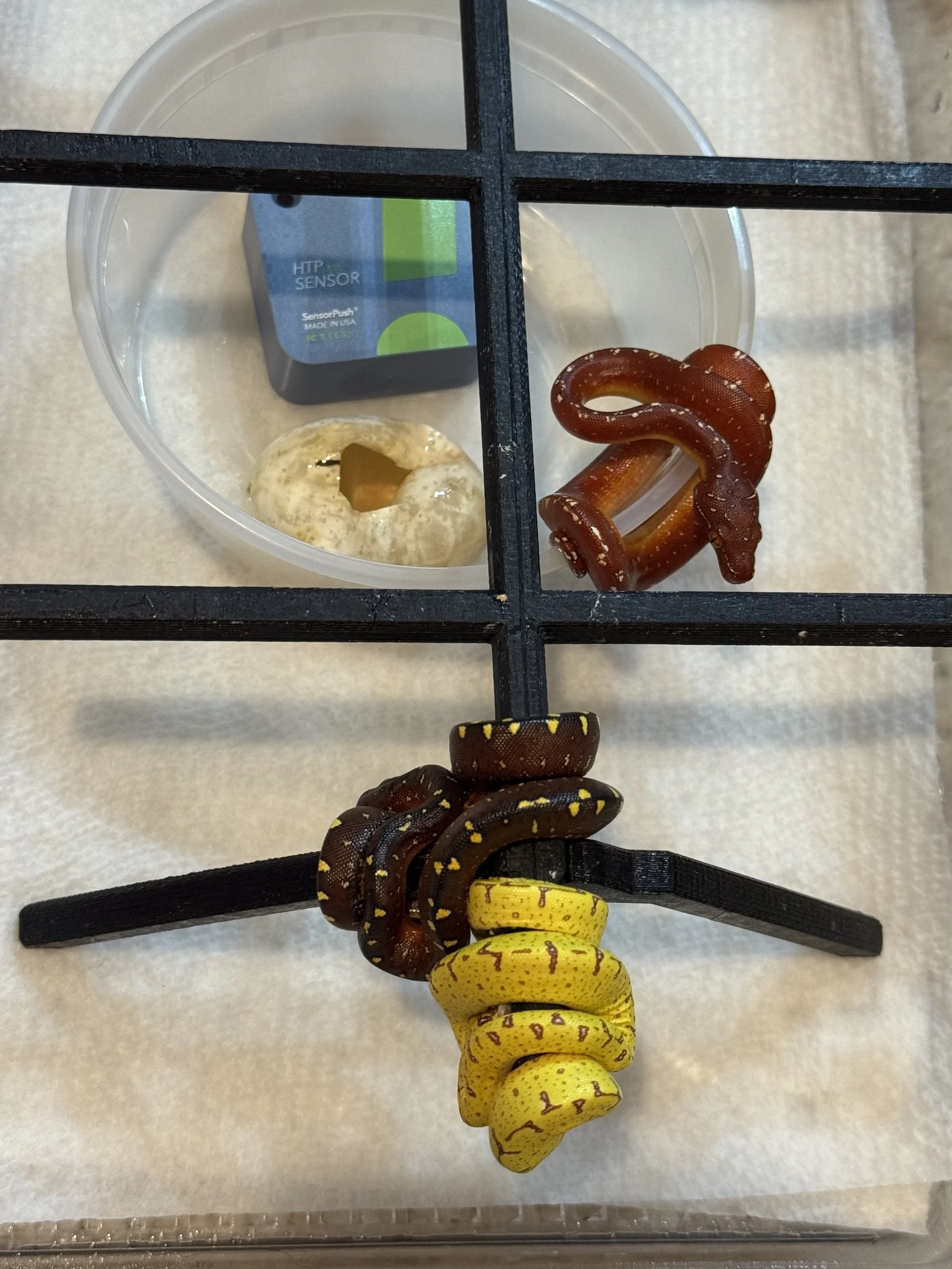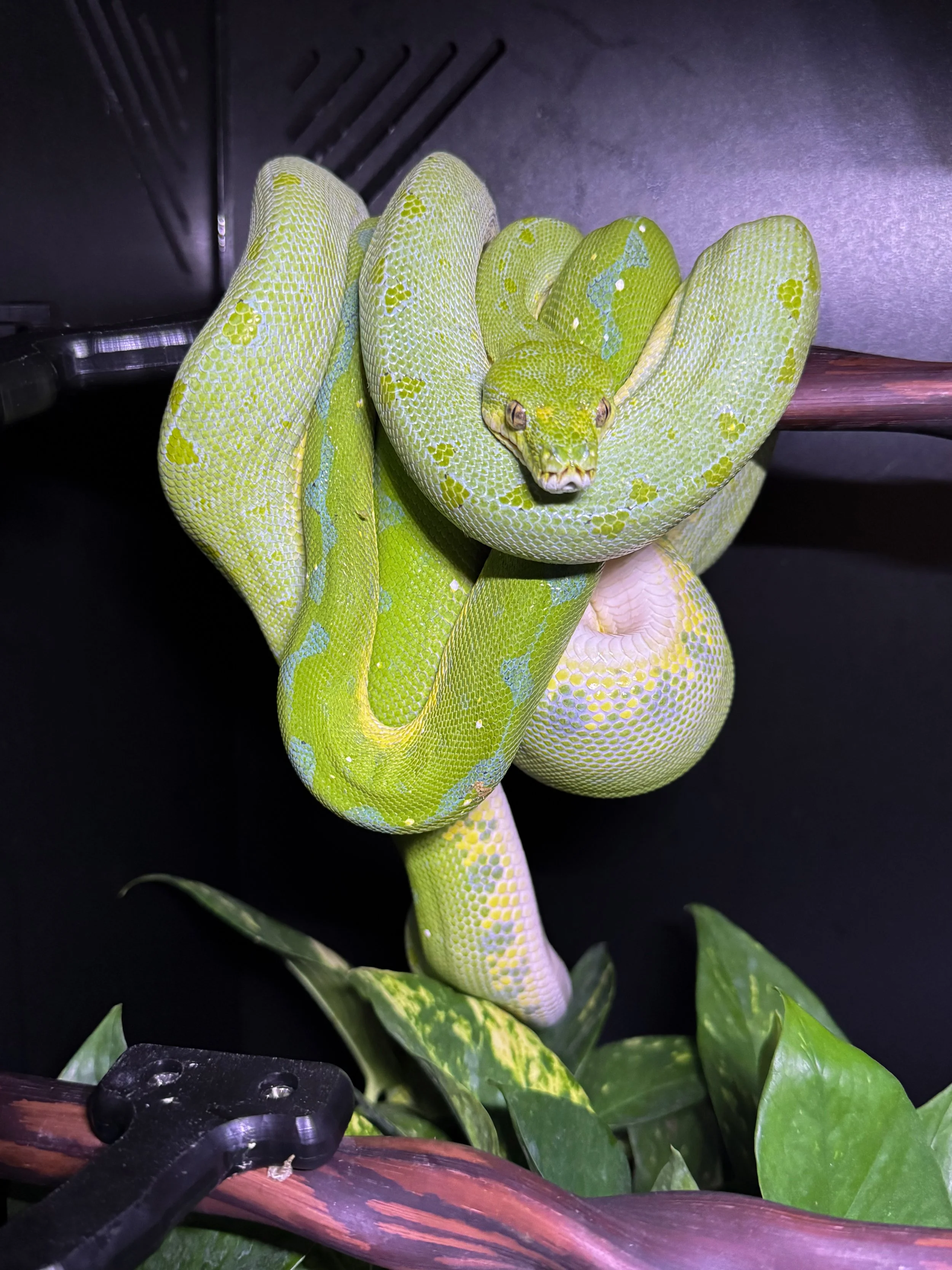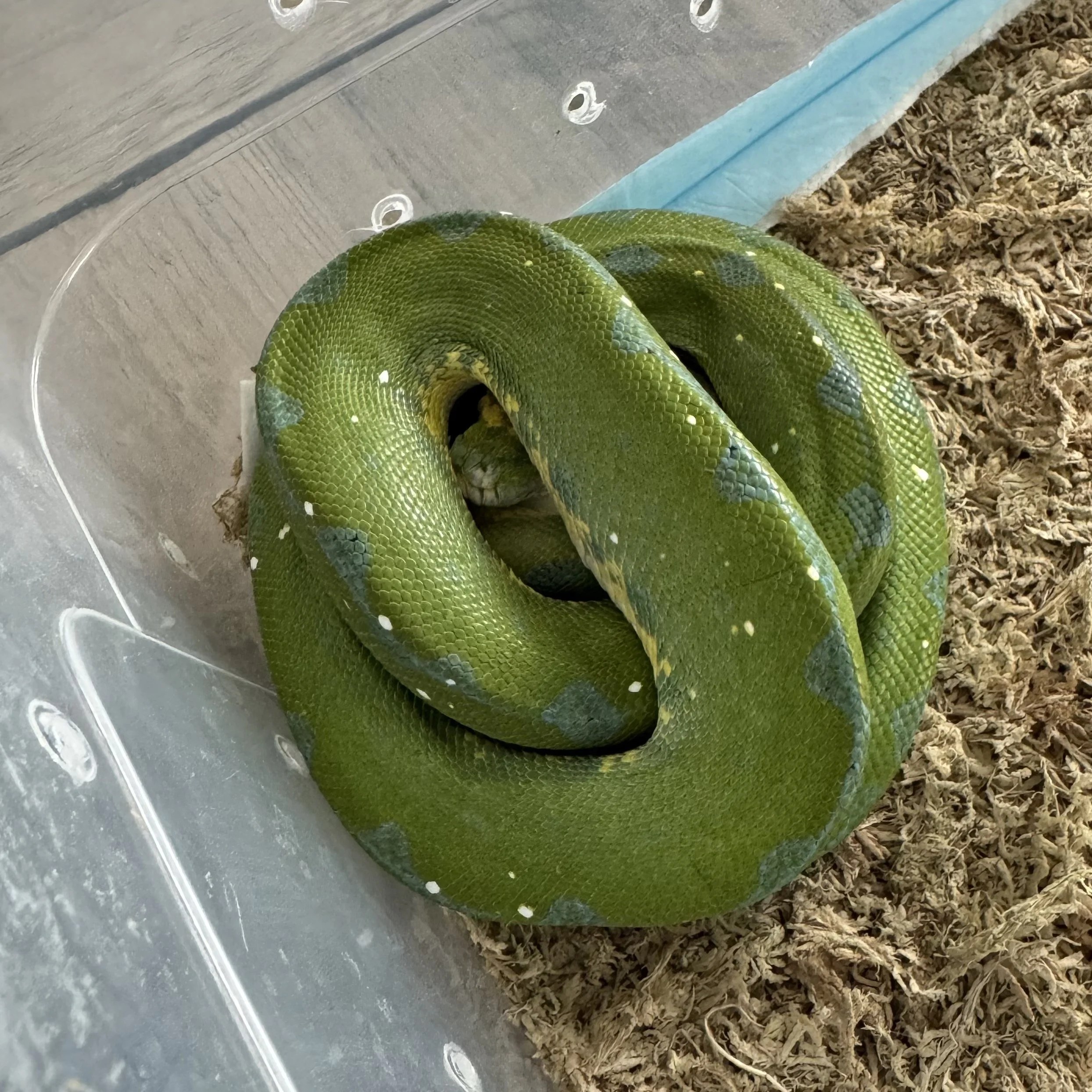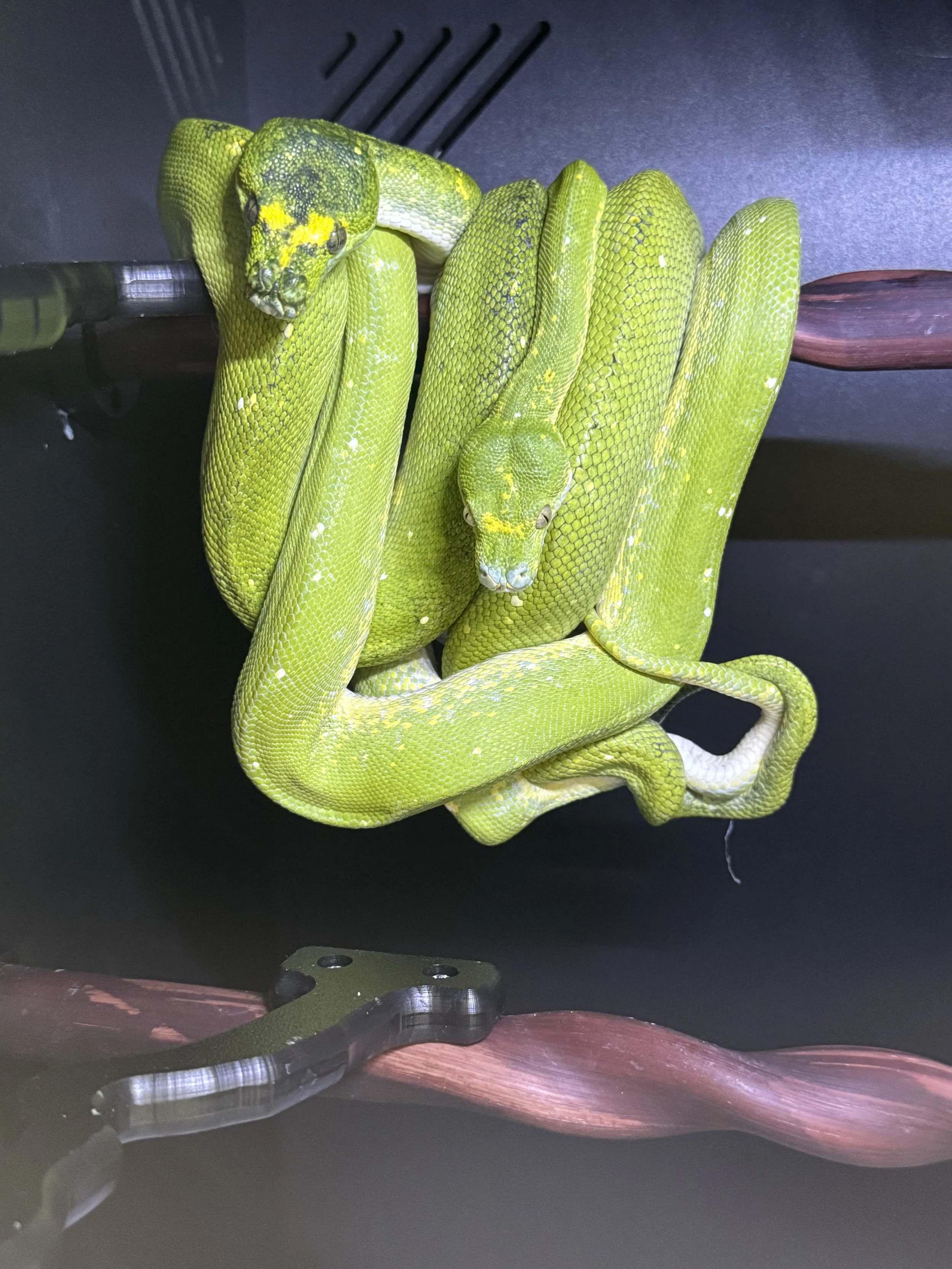 The sire for this clutch was produced by Rod Love at Amore Arboreals. He was a maroon neonate and his sire was out of Popcorn (Biak x OSHY/Trooper Walsh Blueline) to Sissy (Aru x Sorong) while his dam was out of Lucia (Carpetman/Queen) to Duffman (Mr. Blue/Carolina x OSHY). While relatively green, his genetics contain a great mix of both blueline animals as well as high yellow animals. The dam for this clutch was produced by John Leckie at JL Chondros. She is a 4th generation high yellow animal who’s lineage is primarily composed of Robert Worrell’s Jade and Baby Doll lines (which have produced many high yellow and melanistic animals) and Janet Hickner’s Golden Glow Worms. Lumen was a yellow neonate and John’s pairings have notoriously produced outstanding HY animals from both yellow and red neonates. Nine “good” eggs and one slug were laid and resulted in 8 large neonates.