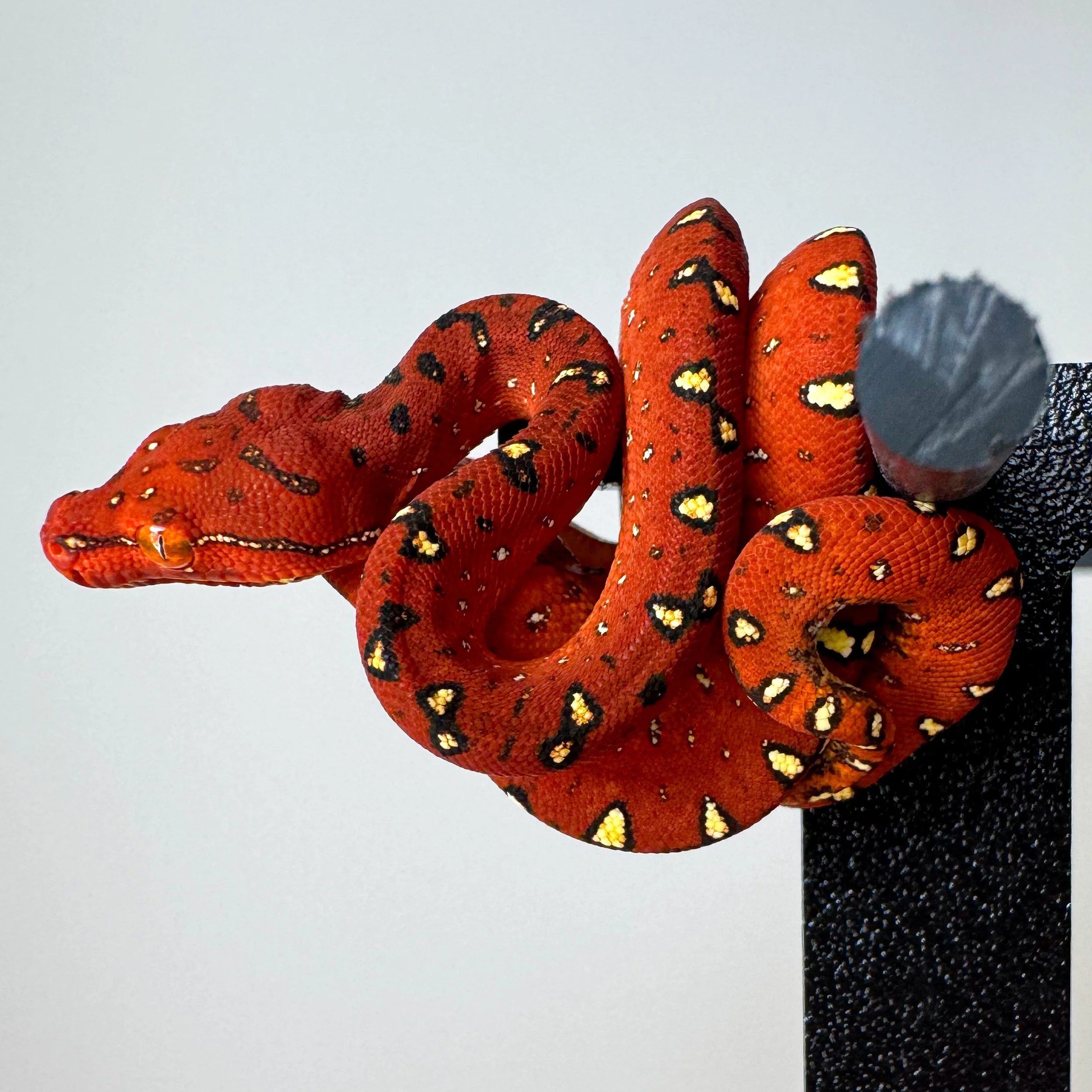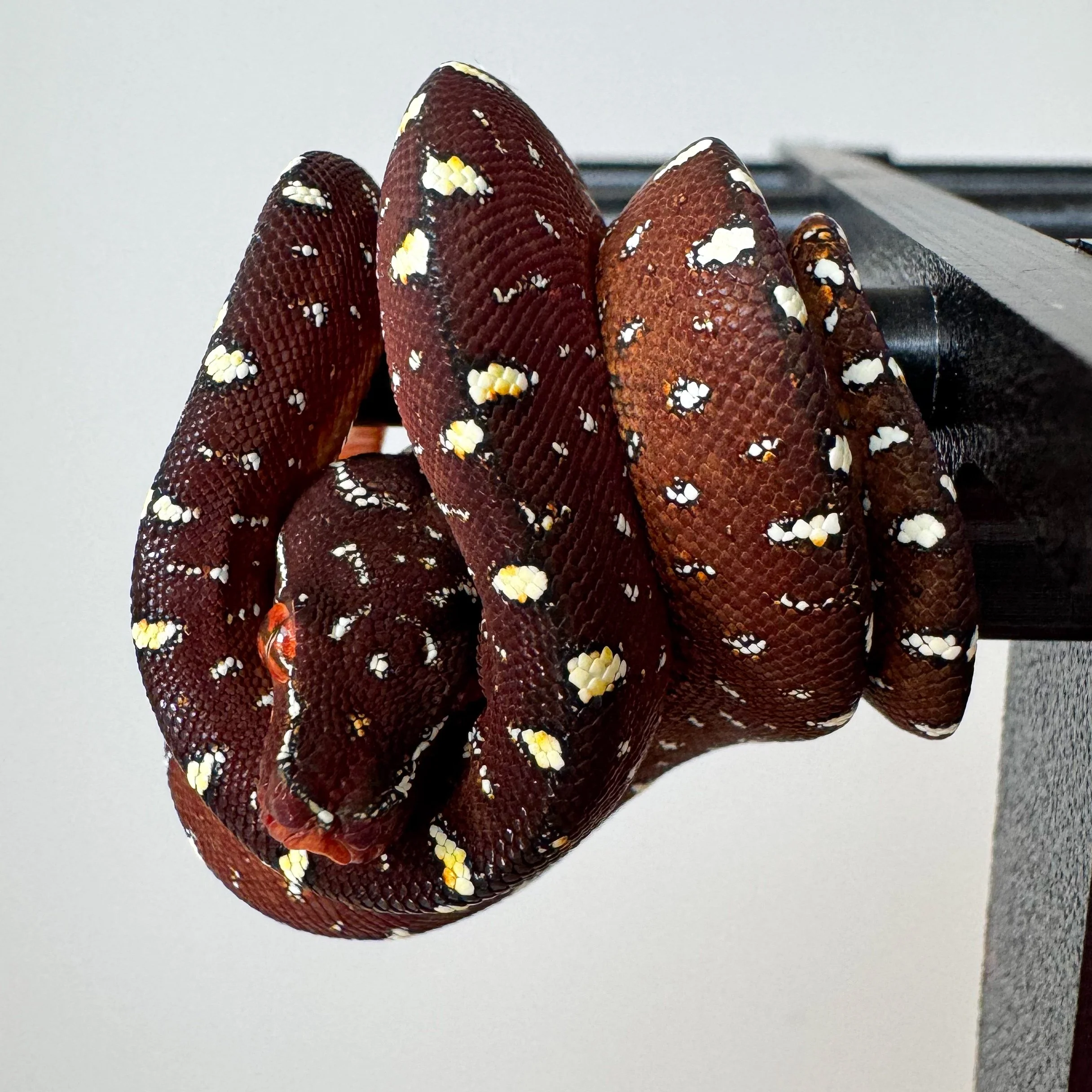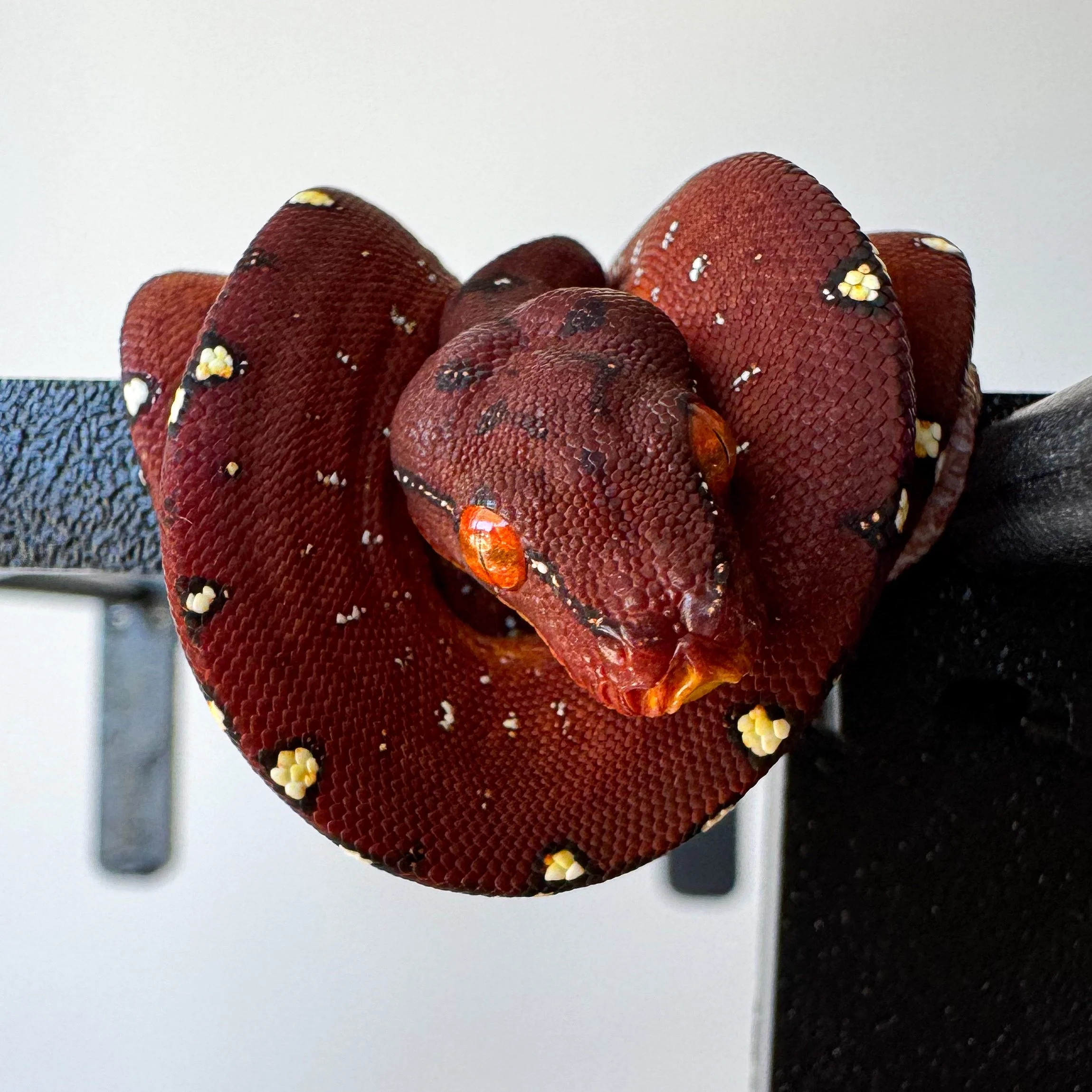 The sire for this clutch was produced by Rod Love at Amore Arboreals. He was a maroon neonate and his sire was out of Popcorn (Biak x OSHY/Trooper Walsh Blueline) to Sissy (Aru x Sorong) while his dam was out of Lucia (Carpetman/Queen) to Duffman (Mr. Blue/Carolina x OSHY). While relatively green, his genetics contain a great mix of both blueline animals as well as high yellow animals. The dam for this clutch was a red neonate imported Biak locality. This clutch was pretty small and composed of mostly slugs, however three eggs were viable and hatched.